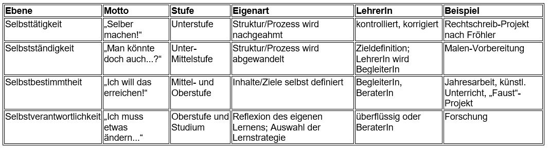 Aus dieser Hypothese ergibt sich, dass eine reflexive Verschriftlichung des eigenen Lernprozesses erst ab der 3. Ebene (Selbstbestimmtheit) beginnt, indem die Lerninhalte und -ziele selbst definiert und dokumentiert werden. Die Metaebene der Lern-(Selbst-)Reflexion wird aber eigentlich erst auf der 4. Ebene erreicht. Zuvor handelt es sich noch um Protokolle oder knappe Selbstbeurteilungen. Verschriftlichung muss für die SchülerInnen einen Sinn haben. Intrinsisch wird dieser erst ab der 4. Ebene. Vorher muss die Bewertung bzw. Wertschätzung von außen kommen; z.B. durch ein Portfolio und dessen Präsentation; und/oder durch die Verwendung der Selbstbeurteilung in einem Zeugnisfach namens „Eigenes Lernen“; usw.